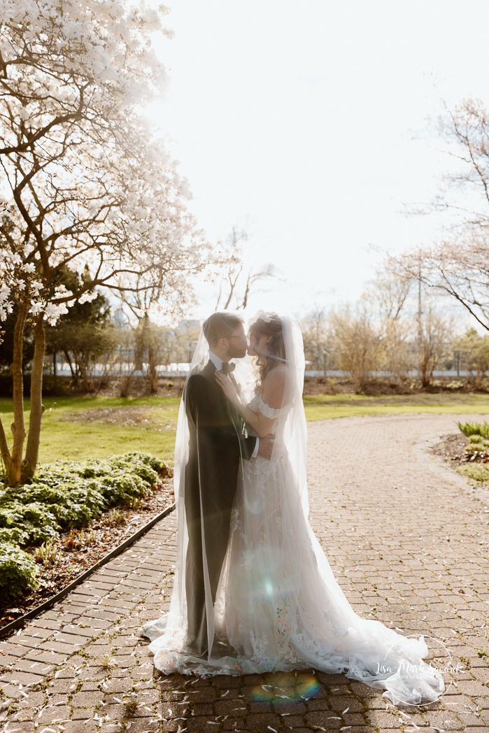 Le photoreportage s’est amorcé avec leur cérémonie sur le bord du canal. Les voir échanger leurs voeux bilingues sous les grands saules pleureurs était si touchant à capturer! Une fois officiellement mari et femme, nous avons profité des Jardins des Floralies pour leurs portraits. Malgré le printemps tardif, les fleurs étaient au rendez-vous. Les jonquilles et les magnolias coloraient le paysage, créant un décor hyper romantique. Un peu plus loin, nous avons même pris quelques clichés avec vue sur la ville en bordure de la piste de course.